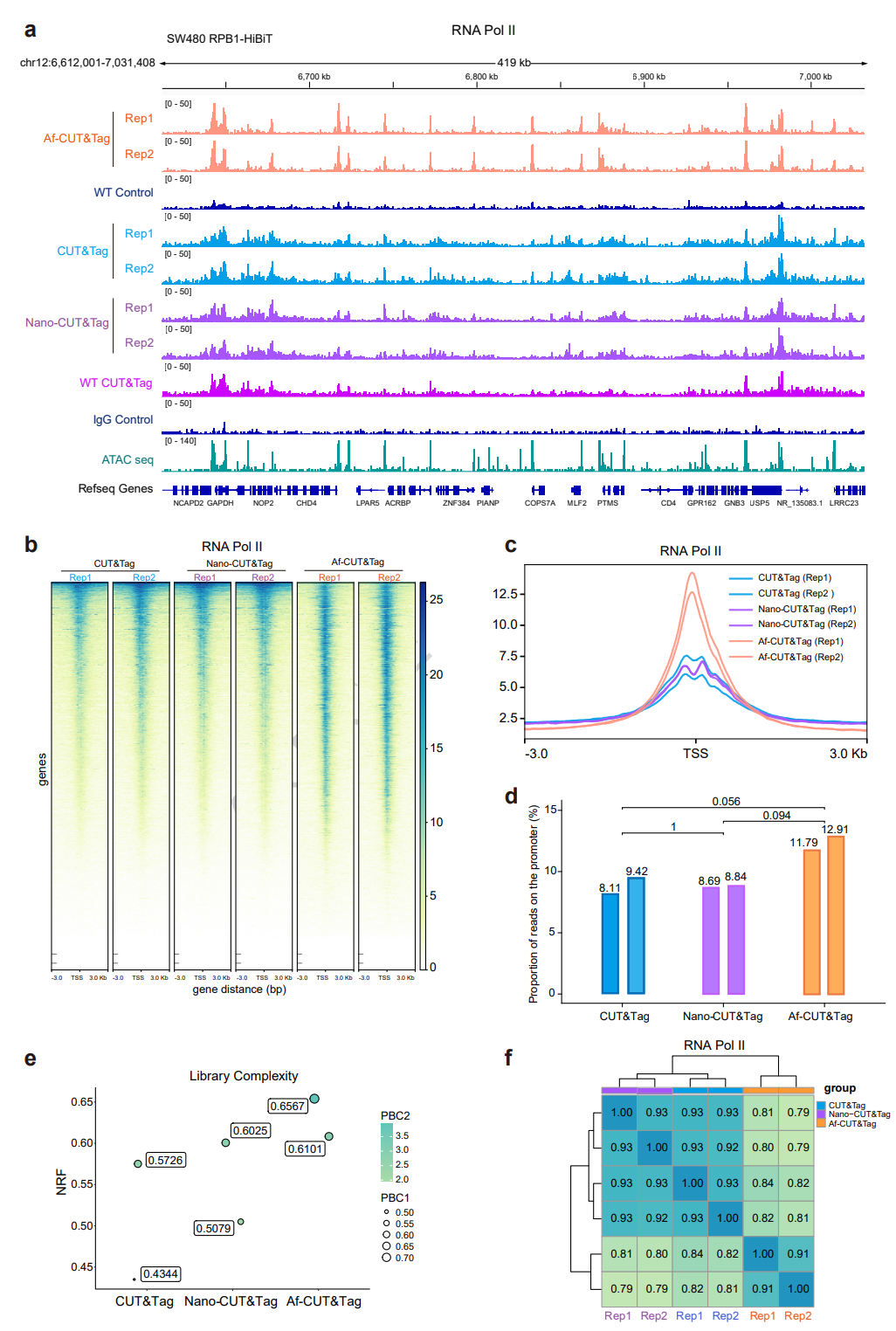 在进一步性能评估中,研究团队分别针对RPB1 Af-CUT&Tag、CUT&Tag和Nano-CUT&Tag数据集绘制了TSS图谱(图2c)。Af-CUT&Tag在这些位点显示出显著更高的信号积累,表明其在使用较少reads的情况下能够更有效地区分调控状态。文库质量分析表明,Af-CUT&Tag在启动子区域的覆盖范围和复杂性方面表现出了更高的性能(图2d、e)。Af-CUT&Tag RPB1分析的重复实验显示出较高的一致性(图2f)。