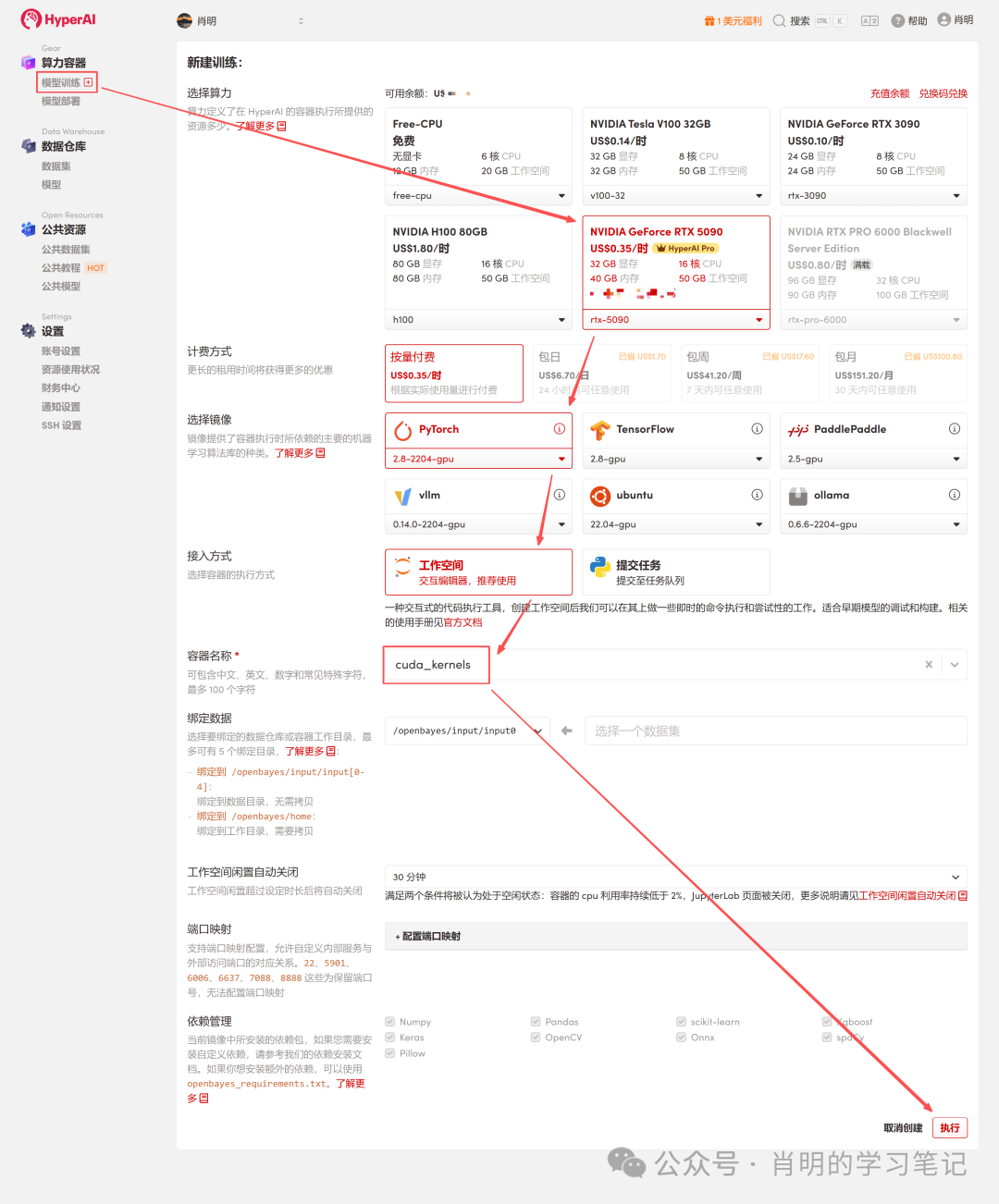 2. 创建容器:点击左侧边栏「模型训练」->「选择算力:5090」->「选择镜像:PyTorch 2.8」->「接入方式:Jupyter」->「容器名称:任意填写,例如cuda_kernels」->「执行」。