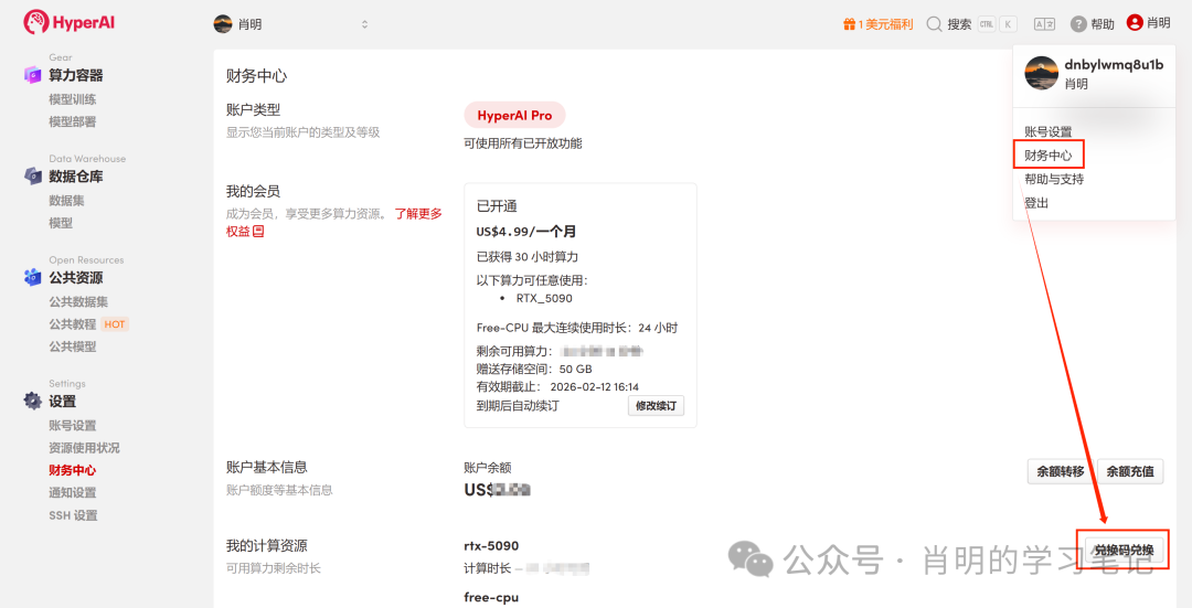 1. 注册与登录:访问 app.hyper.ai 注册账号后,点击右上方「财务中心」,进入后点击「兑换码兑换」,输入「EARLY_dnbyl」领取免费算力。