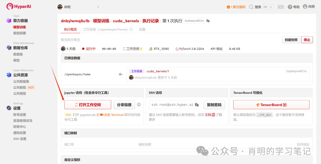 3. 打开Jupyter:实例启动后(状态变为「运行中」),直接点击「打开工作空间」一键即用