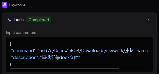 Skywork接收到指令后,首先自主调用终端指令,对目标文件夹进行了一次扫描。