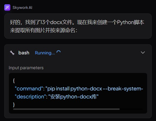 我们只需要告诉它:「把文件夹里所有docx文件里的图片都提取出来,然后根据它是从哪个docx里出来的,对应着给命个名。」