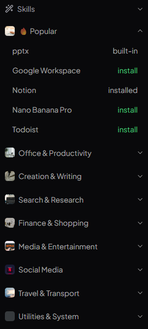 它针对办公场景做了深度清洗,精挑细选了超100个Skills。