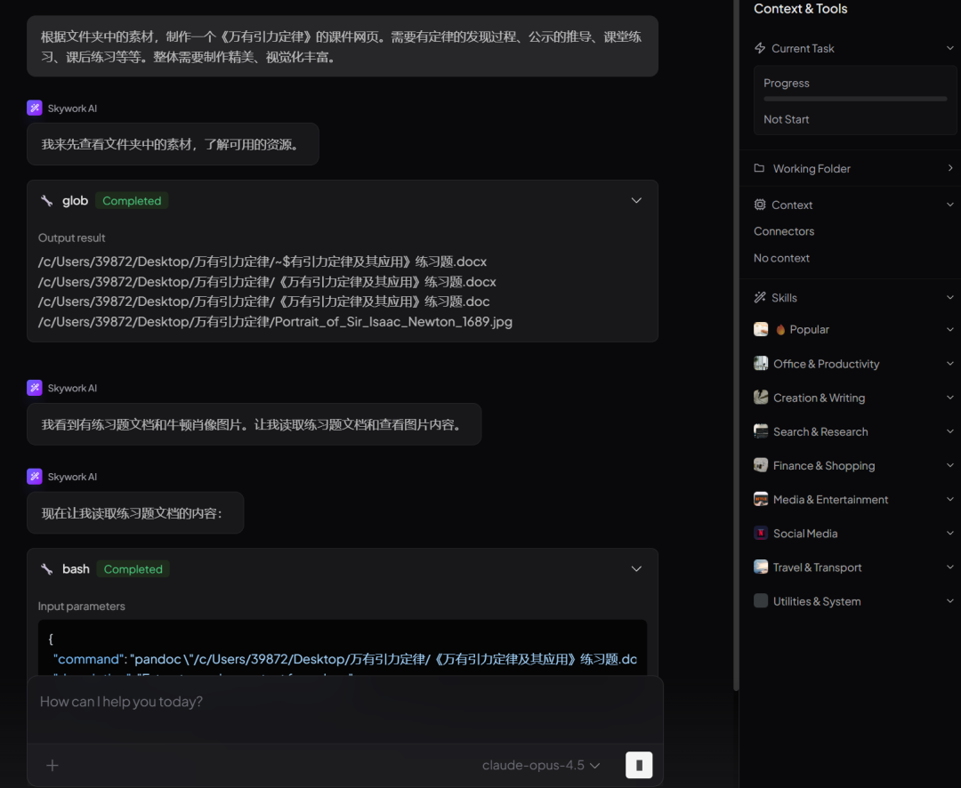 再配上一套会用工具的Skills技能体系,Skywork完全可以成为你的贴身助手,快速完成任务、整理资料、生成内容。