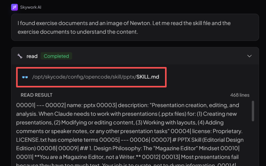 举个栗子,输入「帮我把这两份文档对比一下,做一个带图表的汇报PPT」时,Skywork会自动调用「文档读取」、「数据分析」和「PPT生成」这三个Skills组合。