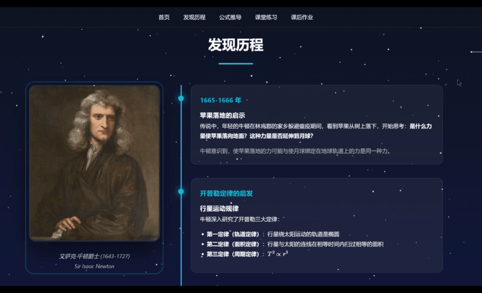 根据文件夹中的素材,制作一个《万有引力定律》的课件网页。需要有定律的发现过程、公式的推导、课堂练习、课后练习等等。整体需要制作精美、视觉化丰富。