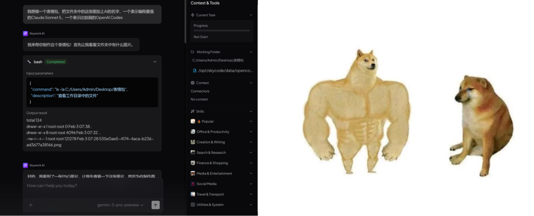 Skywork通过引入Gemini模型,恰恰补齐了这块短板。它的图像、视频生成质量远超同类桌面Agent。