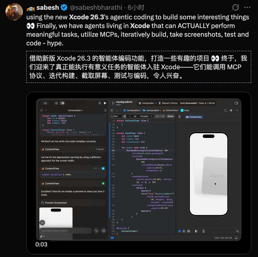 想要快速了解Xcode 26.3可以看这个小哥的视频,速览一遍~