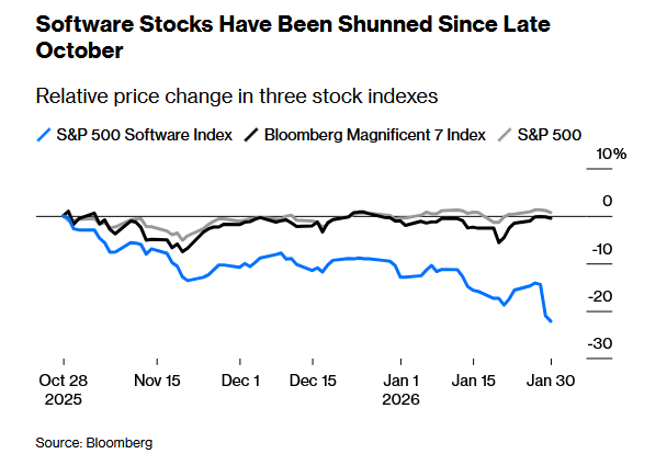 统计显示,过去一个月,标普北美软件指数下跌了18%,跌至2025年4月以来最低水平。