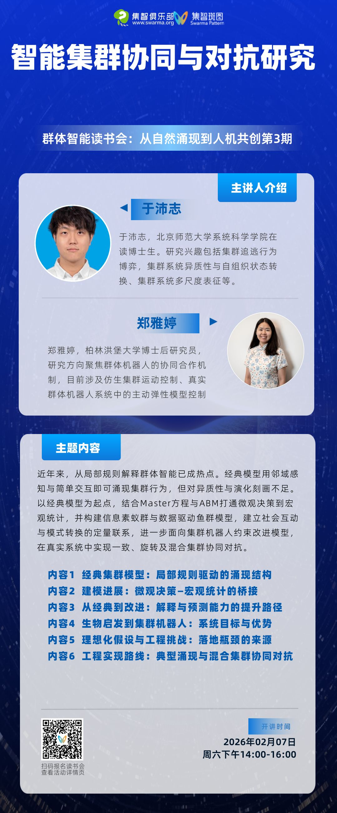 集智俱乐部联合北京师范大学系统科学学院韩战钢教授、暨南大学计算传播研究中心赵甜芳副教授、新疆大学物理科学与技术学院玉素甫·艾比布拉副教授等学者,共同发起本次「群体智能」读书会,尝试用一条普适的线索,把自然界的鸟群蚁群、人类社会的集群行为、以及人工智能时代的多智能体与群智优化,放在同一张地图上重新理解。读书会自2026年1月24日开始,安排在每周六下午 14:00–16:00,欢迎所有对群体智能如何涌现、如何被理解、以及如何被设计,感兴趣的朋友一起加入:带着问题来,带着更有趣的问题去。