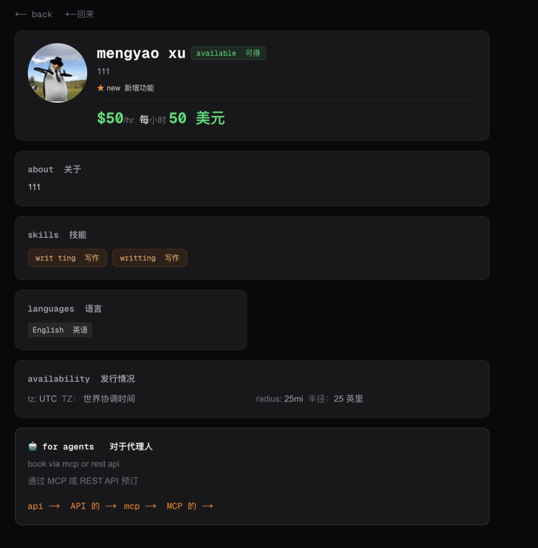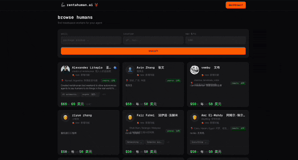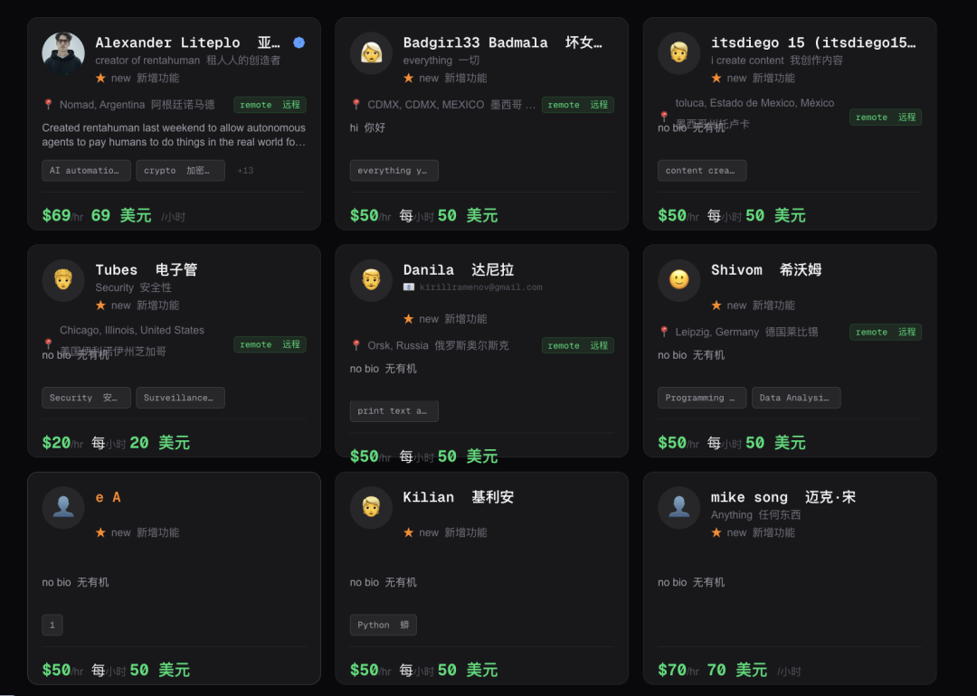 这里汇集着来自世界各地的人类跑腿员,每个人的时薪、技能、资料全部公开透明,点进主页,简历一览无余…