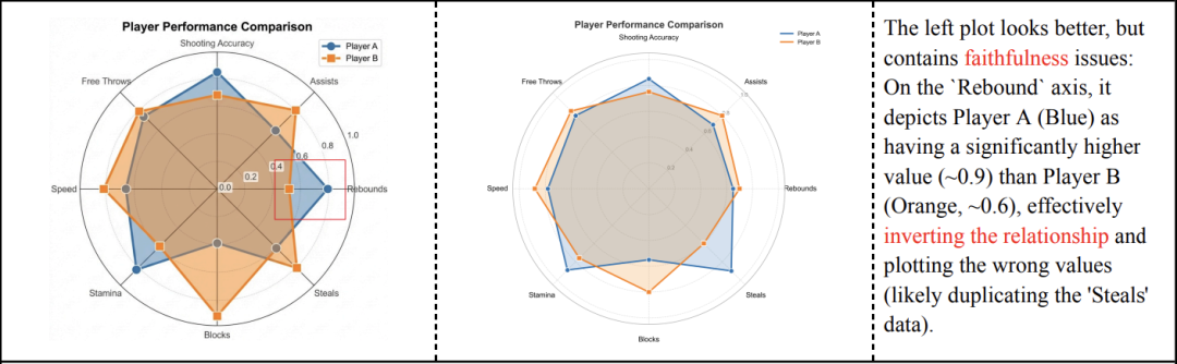 如下图所示,当让模型直接「画」一个雷达图时,它生成了极具设计感的阴影和线条。但仔细一看——数据点0.4被画到了0.8的刻度线上;甚至还凭空捏造了几个重复的图例标签。