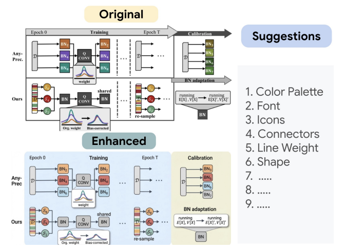 审美增强案例。上边是原始的粗糙框图,下边是AI根据Guidelines优化后的成品。