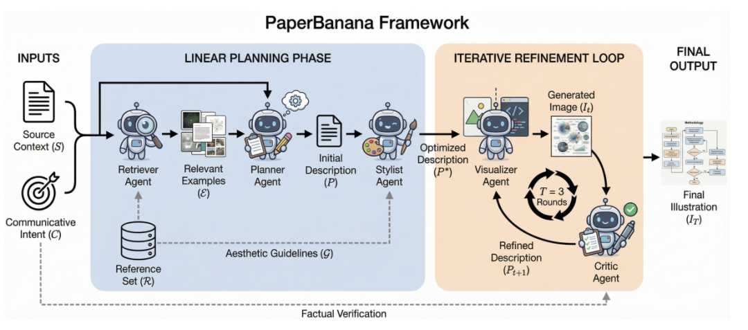为了解决这个问题,PaperBanana做了一个天才般的架构切换。
