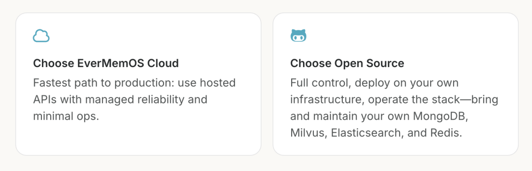 有两种使用EverMemOS的方式,EverMemOS Cloud和开源版本。前者使用托管API,更方便也更快,且核心引擎会自动更新到最新版本,后者则由用户自己运维。