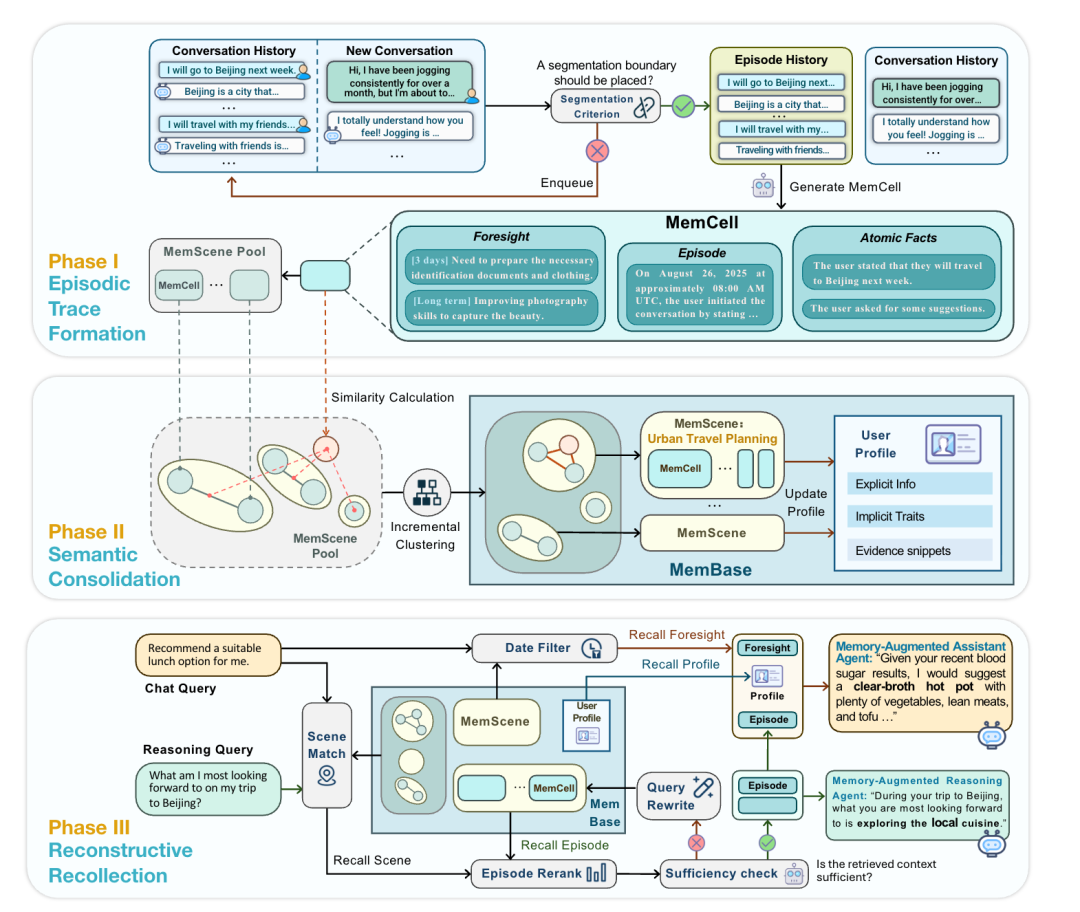 具体来讲,EverMemOS通过模拟人类记忆的形成并转化为计算框架,利用三阶段层层递进以实现大模型长期记忆的存储和提取: