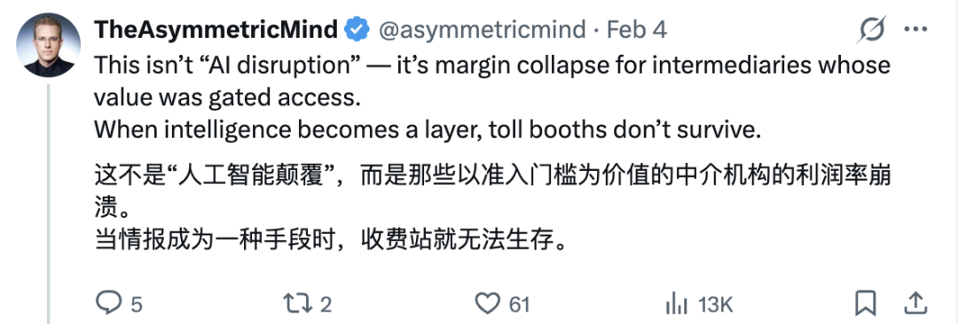 在很多投资者看来,SaaS公司本质上是一层中介:它们提前占据了某个入口,利用信息差和流程复杂度,向客户收取「过路费」。