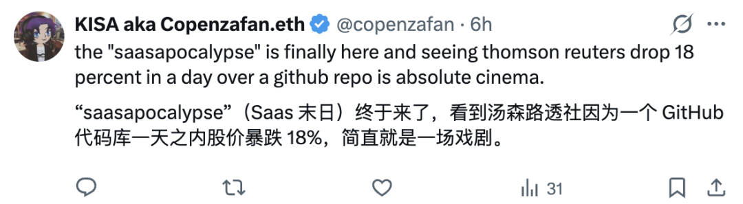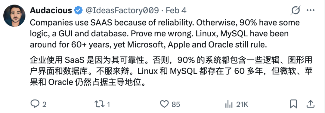 的确,如果AI真的这么容易就能扼杀SaaS,那Office 365、ServiceNow、Datadog早就该倒下了。