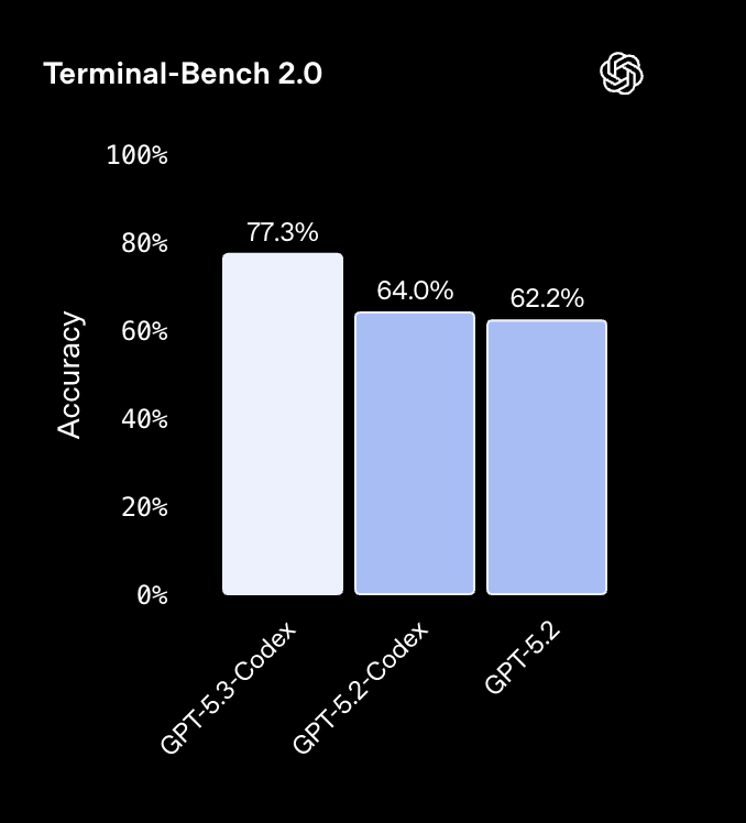 同时,GPT-5.3-Codex在Terminal-Bench 2.0上的表现也有明显提升。