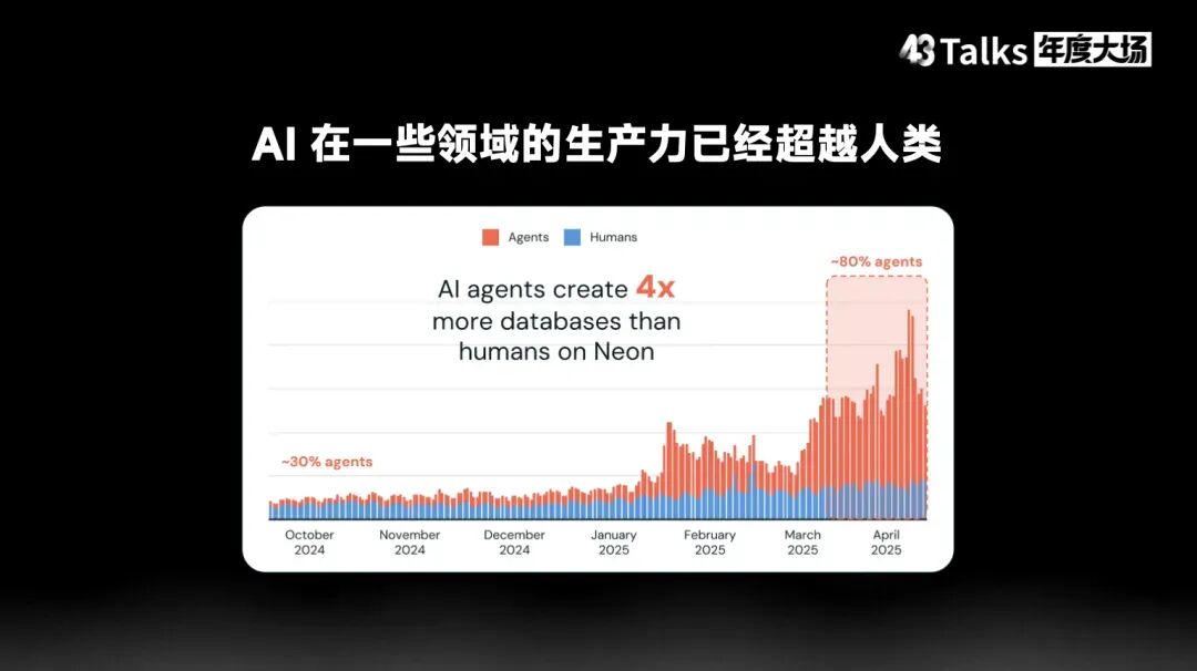 或许大家还未意识到的是,AI 在许多领域的生产力已经超越人类。以 Neon 云端数据库为例,2025 年 2 月由 Agent 创建的数据库数量已经超过人类管理员创建的数量,这在云服务市场已经形成共识。