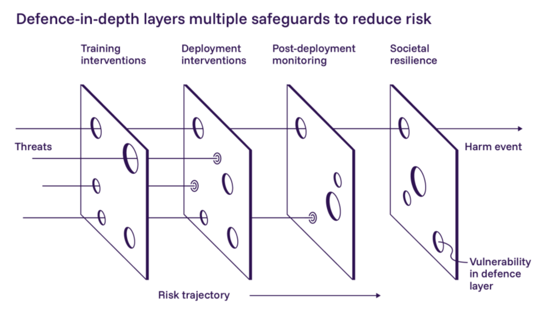 图|“瑞士奶酪图”展示了防御深度方法:多层防御可弥补单层缺陷。当前 AI 的风险管理技术存在缺陷,但通过叠加多层可提供更强有力的风险防护。
