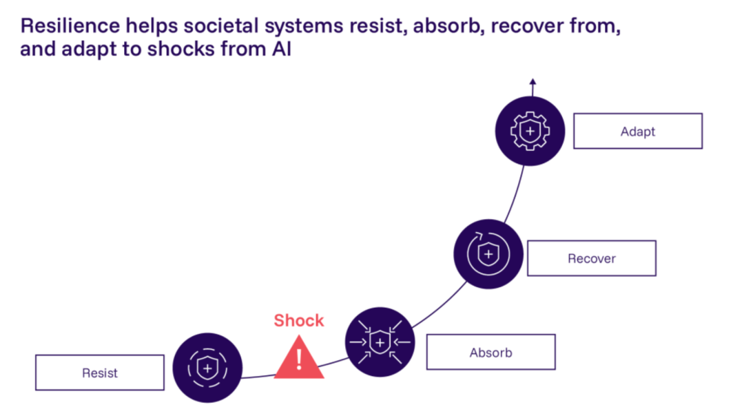 韧性建设措施针对 AI 开发者无法直接控制的风险,如 AI 系统的使用方式、与其他系统的互动以及其影响如何在社会中产生连锁反应。社会韧性为应对更多意外伤害增添了深度防御层。
