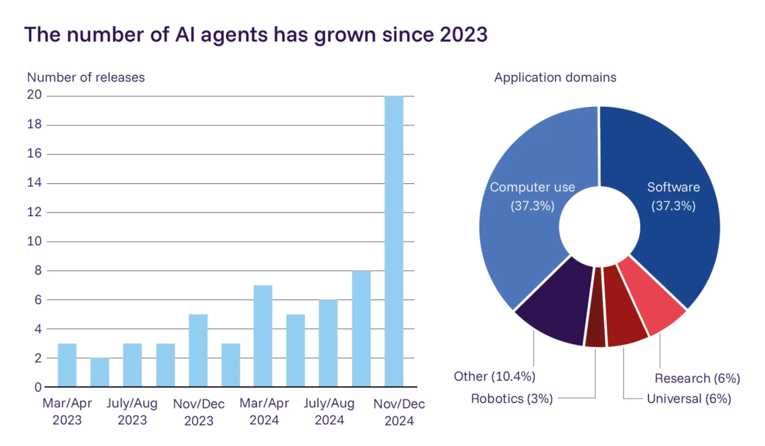 图|对 67 个已部署的 Agent 的调查结果。左:主要 Agent 的发布时间线;右:Agent 的应用领域。来源:Casper 等。