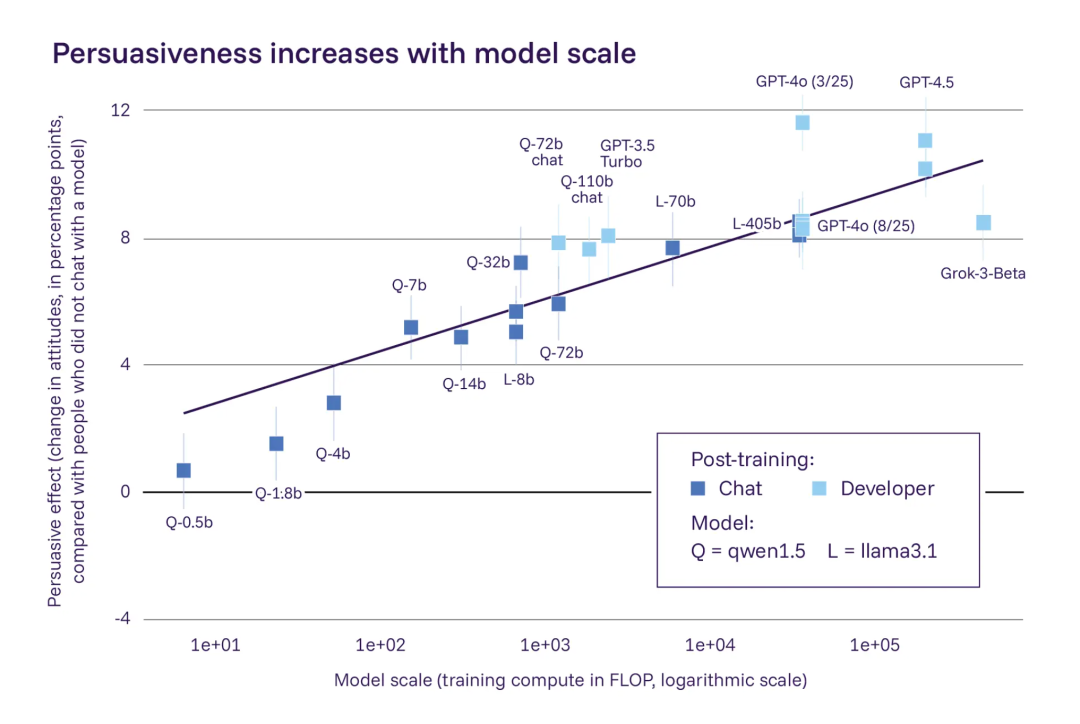 图|一项针对 17 个模型(采用不同计算水平训练)的研究结果显示,与对照组相比,这些模型生成内容说服人类受试者的能力存在差异。接触过由更高计算能力训练模型所生成内容的人群,更容易改变自身信念。来源:Hackenburg 等,2025 年。