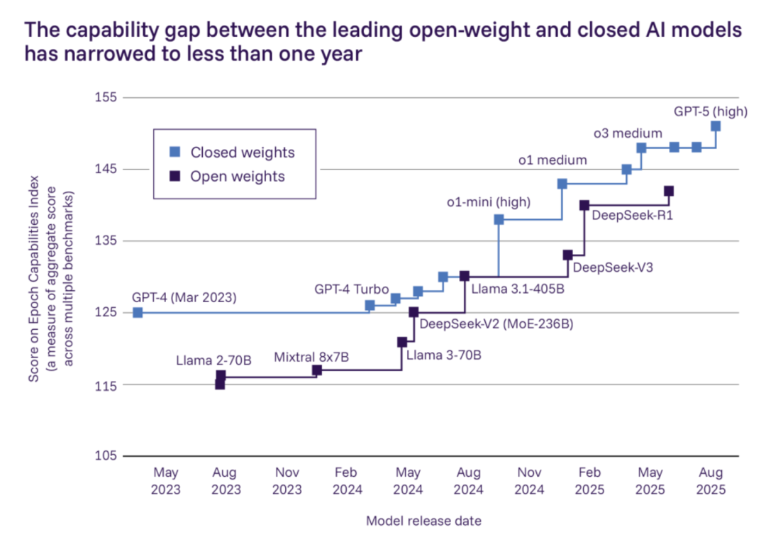 开放权重模型极大促进了全球科研(尤其是资源较少群体),但一旦发布就无法撤回。领先的开放模型与主流闭源模型的差距已缩短至 1 年以内。任何人都可以移除开放权重模型的安全保护并在受控环境外运行,这让传统监管手段失灵。