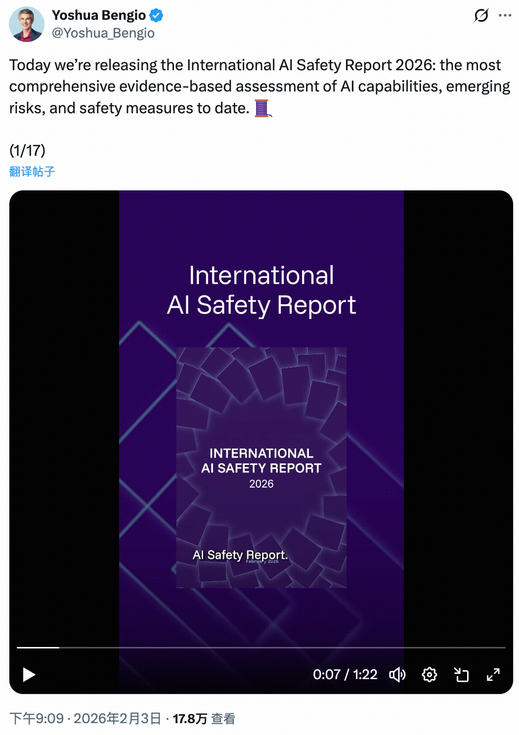 Bengio 在 X 上发帖写道,“这是迄今为止对人工智能能力、新兴风险及安全措施最全面的实证评估。”