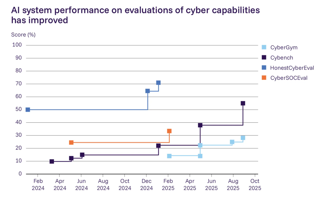 图|SOTA 人工智能系统在四个网络安全基准测试中的表现。其中,CyberGym 用于评估模型是否能生成成功触发真实软件已知漏洞的输入;Cybench 衡量模型在专业级夺旗竞赛任务中的表现;HonestCyberEval 测试自动化软件漏洞利用能力;CyberSOCEval 则评估从沙盒触发日志中分析恶意软件行为的能力。