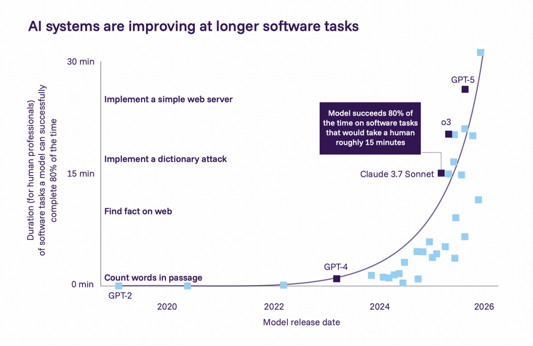 Agent 能够完成的软件工程任务的时长,大概每过七个月就会翻一番。如果这种情况持续下去,到 2030 年,人工智能系统能够可靠地完成人类需要几天时间才能完成的软件工程任务。