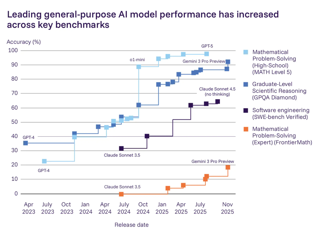 通用型人工智能能力持续提升,尤其在数学、编程和自主运行方面。