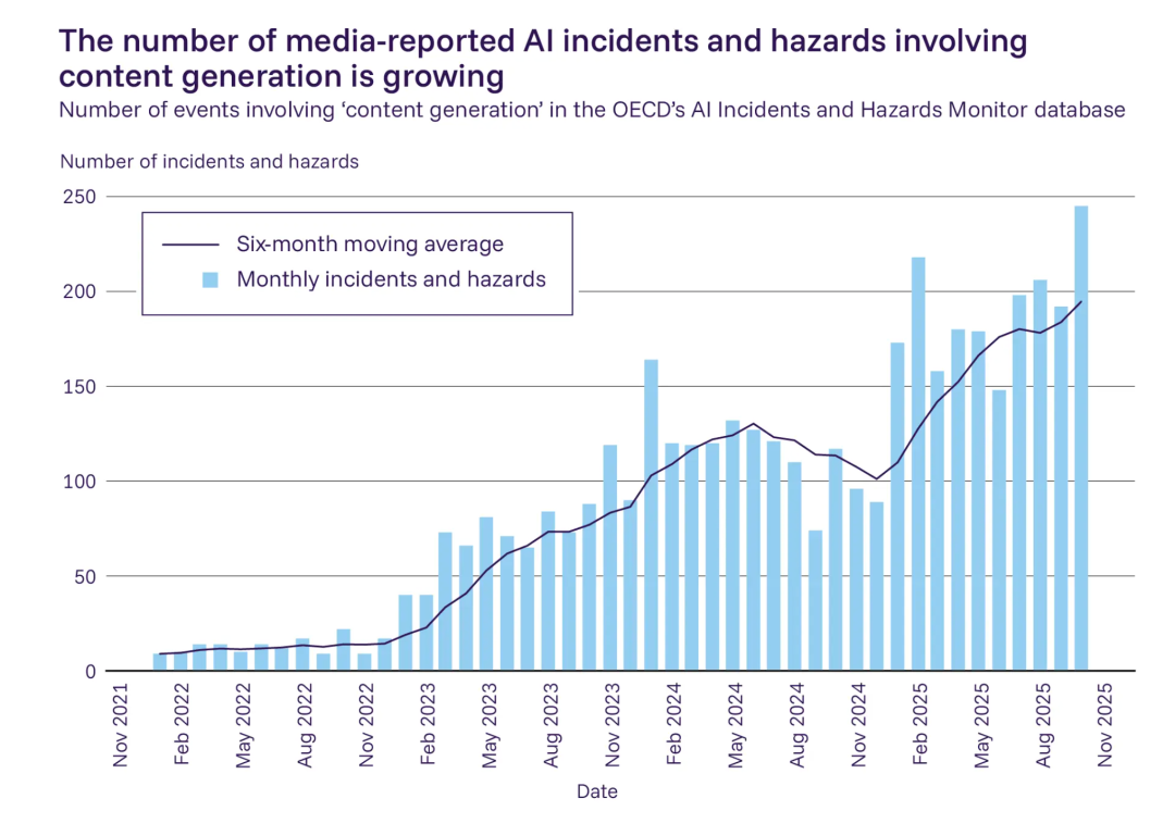 图|经济合作与发展组织(OECD)人工智能事件与危害监测数据库中报告的“内容生成”事件随时间变化的数量。自 2021 年以来,每月报告的事件数量显著增加。来源:OECD。
