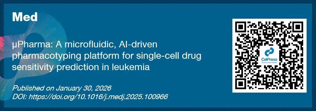 近日,来自美国犹他大学的科学团队在Cell Press细胞出版社旗下期刊Med上在线发表了一篇题为“μPharma: A Microfluidic AI-driven Pharmacotyping Platform for Single-cell Drug Sensitivity Prediction in Leukemia”的重磅研究,提出了一种名为μPharma的新型药敏预测平台。该平台旨在通过检测治疗前的特定生物标志物,无需对细胞进行长期药物暴露,即可在数小时内实现对单细胞药物敏感性的预测。