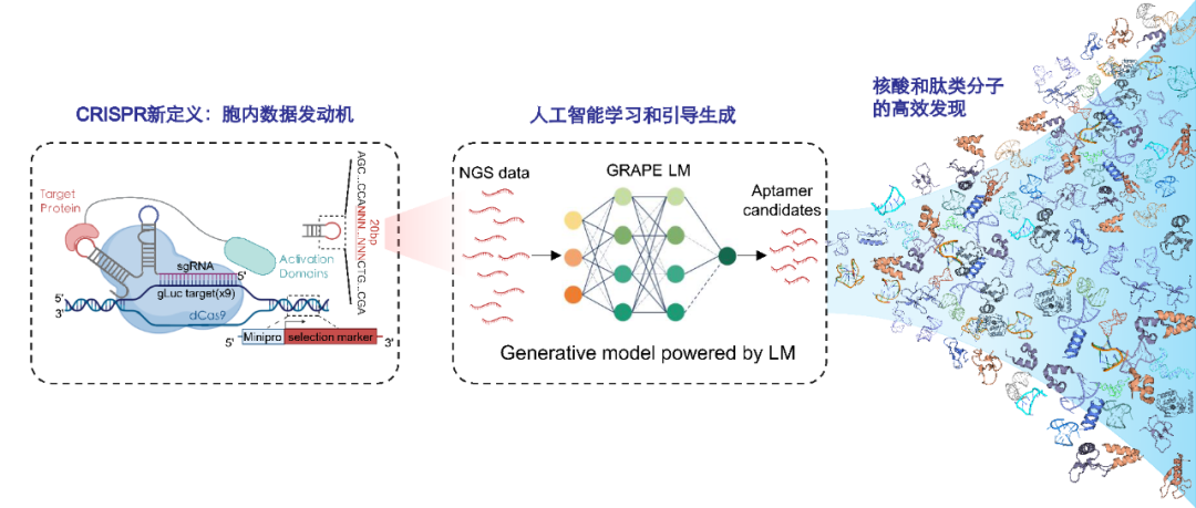 在CRISmers+GRAPE-LM的新范式中,CRISPR脱离了基因编辑的框架,在这里扮演的是“高保真胞内RNA数据发动机”,捕获SELEX等体外方法难以复现的胞内内源生物学机制;而GRAPE-LM则通过外推有限起始文库,补足CRISmers通量受限的短板,并且引导生成更高活性RNA适配体。