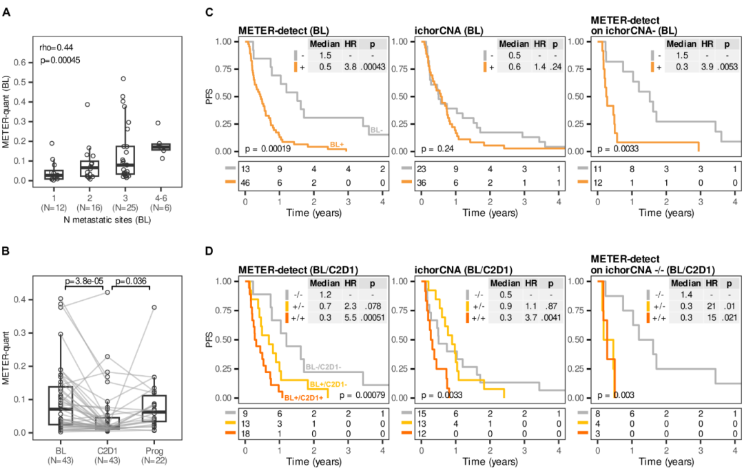 与ichorCNA相比,METER-detect在PFS和总生存期(OS)方面均显示出更高的检测灵敏度和更有效的预后分层,即使将分析限定于ichorCNA患者,且在调整临床相关协变量后,相关性仍保持显著。值得注意的是,METERdetect可作为比影像学检查更早提示疾病进展的工具。