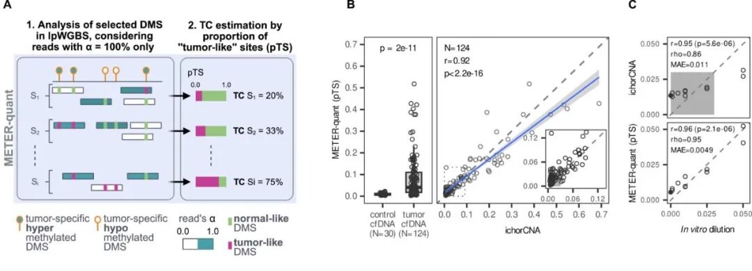 METER-quant模块旨在从血浆cfDNA低通量甲基化测序图谱中实现准确的TC量化,通过评估常见肿瘤类型特异性DMS的甲基化状态,并计算肿瘤样CpG位点的比例(pTS)来提供TC估计值(图2A)。在MIMESIS-1数据集的154份血浆样本中,METER-quant估算的124个转移性乳腺癌cfDNA样本的TC值与使用最先进的工具ichorCNA所获得的值高度一致(相关性 R>0.90)(图2B)。METER-quant对低TC值(在ichorCNA估算3%-10%范围内)的估计也十分准确且具有可比性。再进一步分析中,METER-quant能够精确地估计到0.5 - 1%范围,与预期值的相关性更高(R = 0.96),并且离散度更低(MAE = 0.005,RMSE = 0.006),优于 ichorCNA(图2C)。
