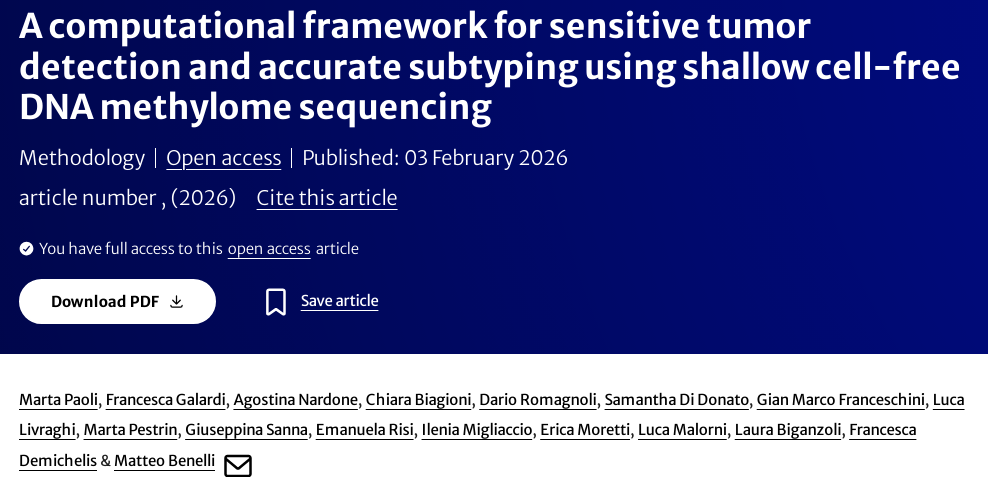 Paoli, M., Galardi, F., Nardone, A. et al. A computational framework for sensitive tumor detection and accurate subtyping using shallow cell-free DNA methylome sequencing. Genome Med (2026). https://doi.org/10.1186/s13073-026-01603-3