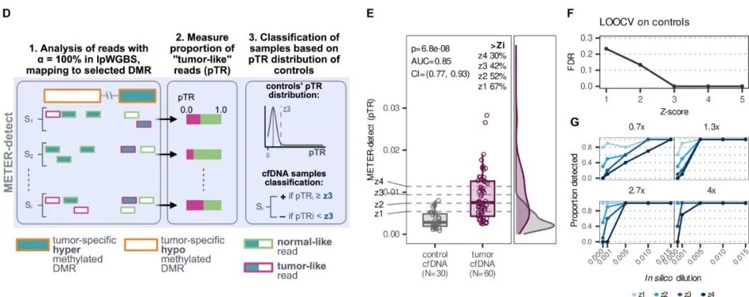 METER-detect旨在检测在低TC条件下的ctDNA,通过评估映射到DMR的reads甲基化状态,计算肿瘤样reads的比例(pTR),并根据对照组pTR的分布将样本分类为 ctDNA+/-(图3D)。研究团队将METER-detect应用于MIMESIS-1的对照和肿瘤cfDNA样本,并重点关注了60个未被 ichorCNA检测到的肿瘤样本。研究显示,METER-detect检测的pTR值在肿瘤样本和对照样本之间显著差异(图3E),具有更高的灵敏度和特异性。进一步计算机模拟评估显示,METER-detect对于TC为1%和0.5%的情况,敏感度分别为100%和60%,其敏感度可能会随着覆盖水平的提高而增加(图3G)。