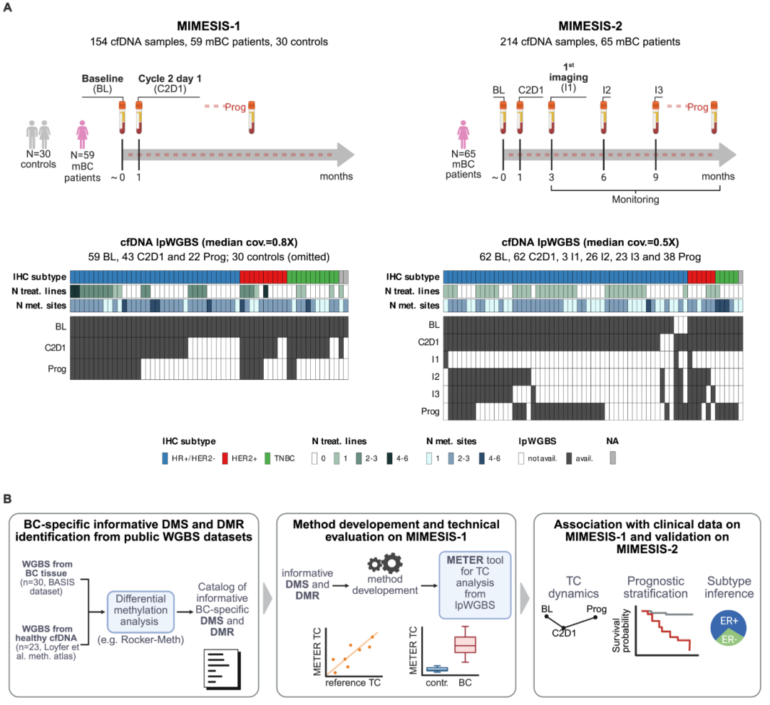 研究团队希望开发一种实用且经济高效的ctDNA检测、定量和分子的分析策略,并有望在转移性疾病的常规临床应用中得到应用,包括早期治疗阶段。为此,研究团队对两个来自早期治疗的转移性乳腺癌患者队列进行了研究:MIMESIS-1(测试队列,包含30名健康捐赠者和59名转移性乳腺癌患者的154份血浆样本)和MIMESIS-2(验证队列,包含65名转移性乳腺癌患者的214份血浆样本),对所有血浆cfDNA样本均进行了lpWGBS(图1A)。