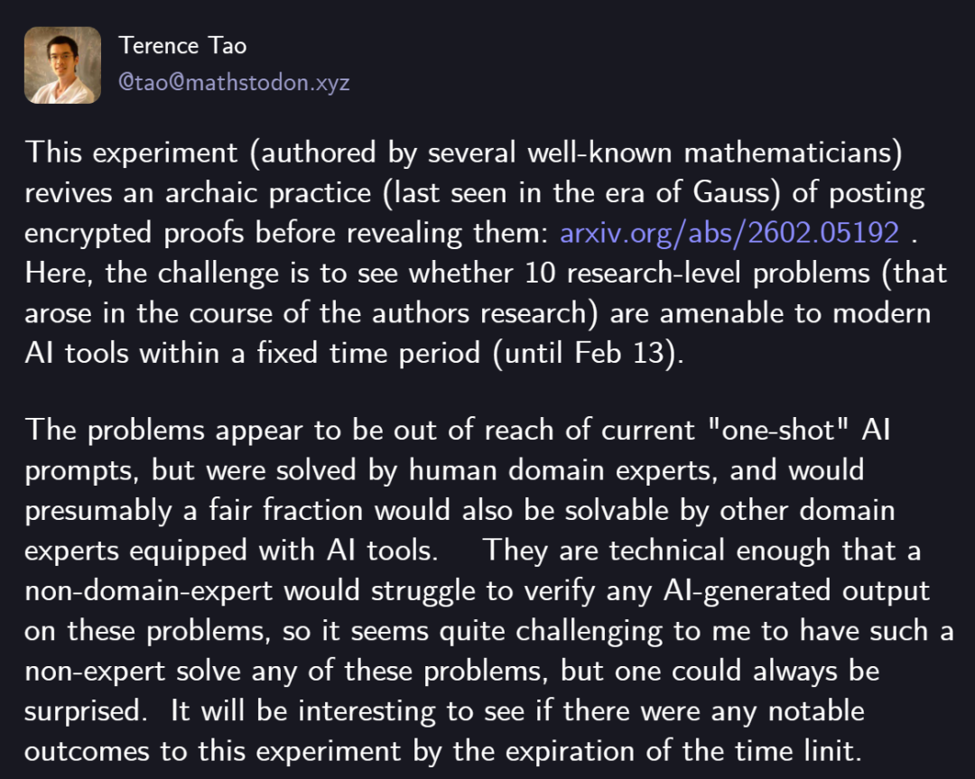 因此在我看来,要让非专家解决其中任何一个问题都极具挑战性——当然,意外惊喜也并非不可能。在截止期限前,这项实验能否产生任何显著成果,将十分值得关注。