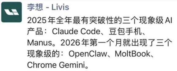 而2026年第一个月就出现了三个现象级的产品:OpenClaw、MoltBook、Chrome Gemini。
