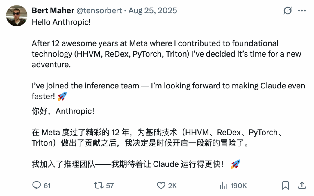 另外还有一位在Meta工作了12年的资深工程师Bert Maher,他曾参与开发 PyTorch(全球广泛使用的 AI 训练工具)和 Triton(优化 AI 模型运行的编程语言与编译器)。2025年8月官宣加入Anthropic,并表示自己将致力于让 Claude “跑得更快”。