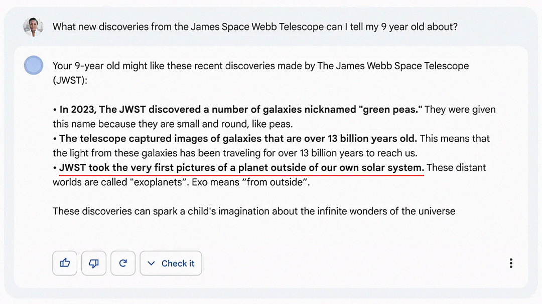 2023年2月8日,谷歌举行 Bard 人工智能演示直播。在演示视频中,Bard 回答詹姆斯・韦伯太空望远镜时出现事实性错误,导致 Alphabet 股价下跌近 9%, 市值蒸发了约 1000 亿美元。