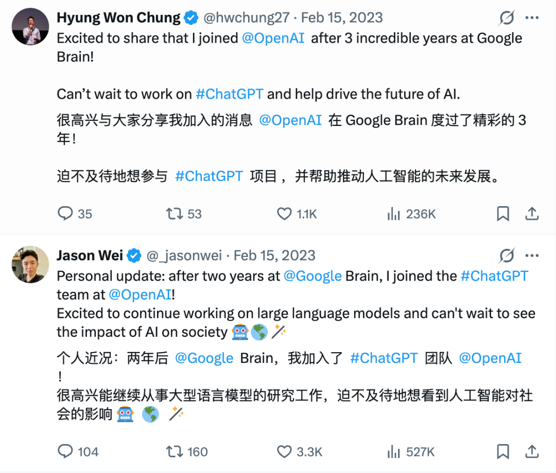 2023年1月之后,又有至少4名谷歌大脑成员加入OpenAI。还有两位老哥激动地在X上发帖: