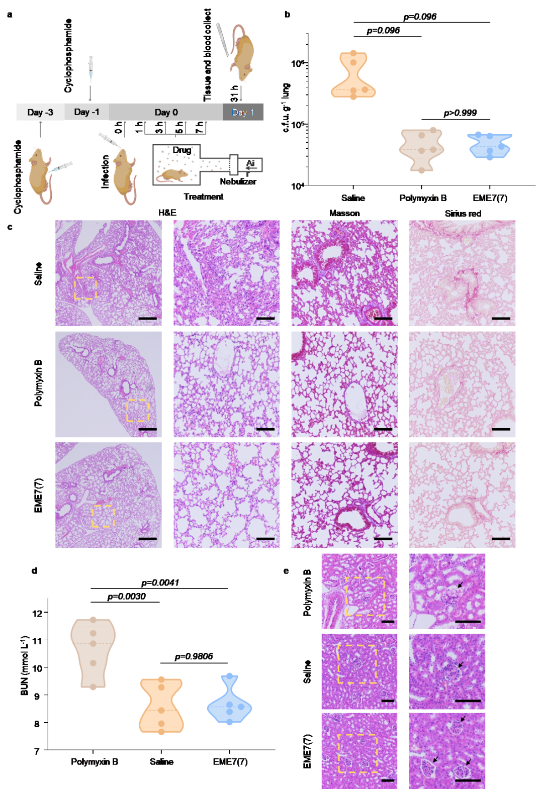最后,作者使用小鼠肺炎动物模型证明EME7(7)抗菌肽的体内治疗效果(图5)。在与临床药物多粘菌素B的头对头比较中,EME7(7)展现出相媲美的体内治疗效果,能够杀灭超过95%的肺部细菌(图5b,c)。更值得一提的是,EME7(7)在体内应用中表现出优于多粘菌素B的肾毒性,使其展现出优异的临床潜力(图5d,e)。