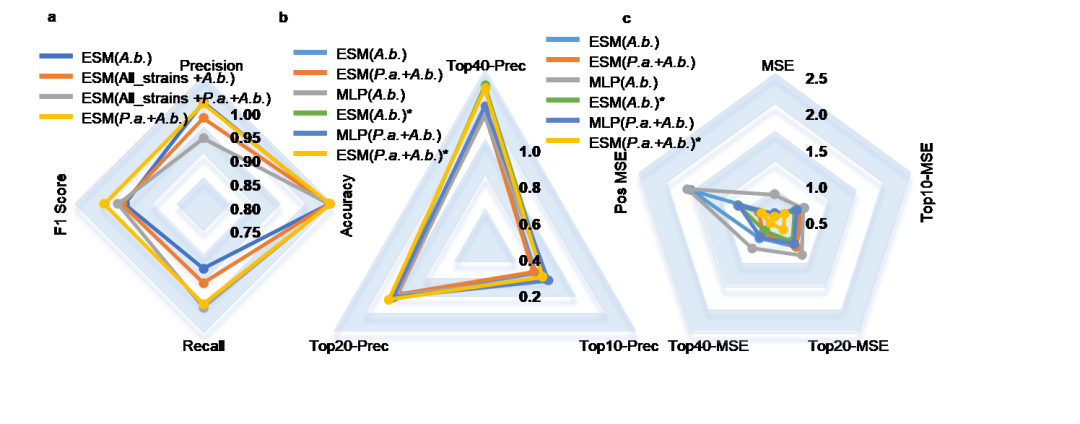 针对每个模型,作者选择预训练模型ESM作为基模型,再使用相似数据—抗绿脓杆菌肽(1186条)做微调,最后使用抗鲍曼不动杆菌肽进行二次微调,分别训练分类、排序、回归模型(图1b)。实验结果显示,相比于直接训练,采用预训练模型+多步微调训练能大幅提升每个模块模型的预测能力(图2)。