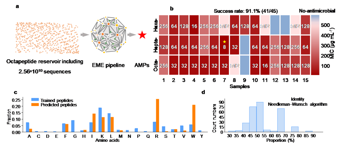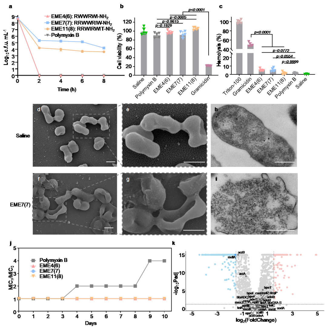 模型训练完成后,作者将其串联为“分类-排序-回归”工作流,从多肽理论库(20n)中挖掘强效抗鲍曼不动杆菌肽。使用该工作流,分别从六肽(0.64亿)、七肽(12.8亿)以及八肽(256亿)全文库中挖掘抗菌肽。湿实验结果表明,91.1%(41/45)的多肽表现抗菌活性(图3a,b)。其中,EME7(7)表现出对抗鲍曼不动杆菌优异的抗菌性能,MIC达8 μg/mL。并且,由工作流筛选的多肽与已报道的抗菌肽展现较低相似性,具有新颖性(图3c,d)。除抗菌活性外, EME抗菌肽还表现出较强的杀菌动力学,在2h内就可杀灭~109细菌;展现较低的溶血毒性以及细胞毒性,赋予抗菌肽优异的治疗窗口(图4a-c)。