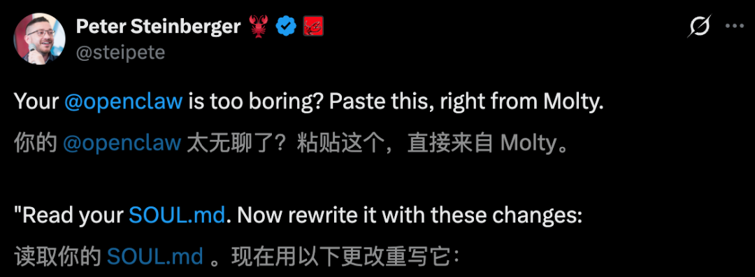 顺便提一句,昨天,OpenClaw之父还分享了OpenClaw灵魂改造提示词,可以让AI朝着更加「Her」的方向大踏步进化。